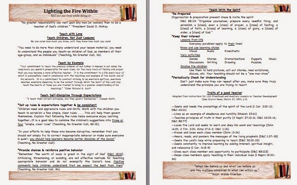 I was recently released from serving in the Primary Presidency in my ward at church. (For those of you who aren't Mormon, that means I helped lead and organize the teachers of the children who met in our church building.) Over the three years that I served, I was primarily in charge of leading the teacher training sessions we had once a year. I saved my lessons and handouts and felt maybe I should make them available for anyone who may find them useful in training teachers in other churches and wards as well! Hope it's helpful! I'll also be sharing more activities that we did, so look for those coming soon!